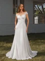Sleeveless A-line wedding dress with an off-the-shoulder neckline, lace appliques, and a cathedral train in chiffon fabric.