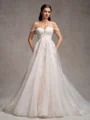 Elegant A-line wedding dress with an off-the-shoulder neckline, sleeveless design, and delicate lace appliques. The gown features a stunning cathedral train crafted from airy tulle, creating a romantic and timeless bridal look with a touch of sophistication.
