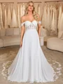 This romantic A-line wedding dress features an off-the-shoulder neckline that elegantly frames the shoulders and collarbones. Crafted from flowing chiffon, the bodice is beautifully adorned with intricate lace appliques, adding delicate texture and charm. The sleeveless design enhances the graceful silhouette, while the corset waist cinches for a flattering fit. A chapel-length train completes the look with timeless elegance, perfect for a memorable wedding day.