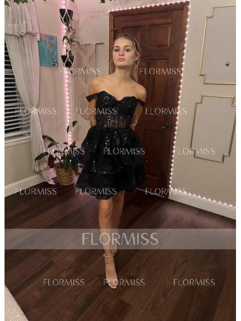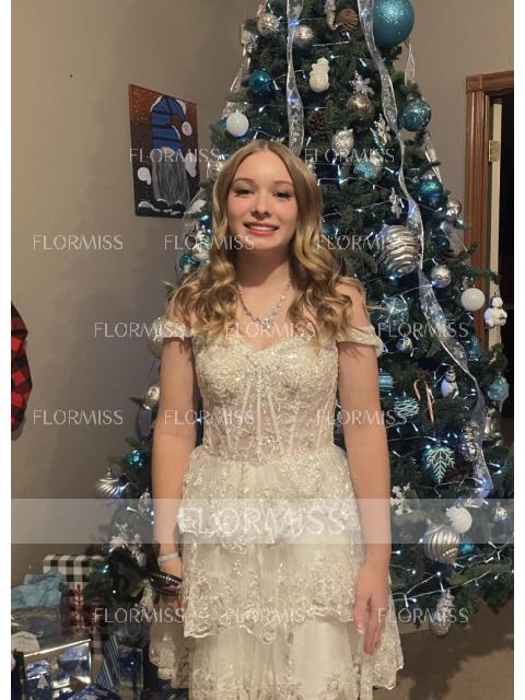 This A-line tulle dress boasts an off-the-shoulder neckline and sleeveless design adorned with delicate lace appliqu