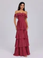 This charming A-line bridesmaid dress features an off-the-shoulder neckline and a sleeveless design, exuding elegance and romance. Crafted from soft chiffon, it showcases cascading ruffles that add movement and texture, enhancing its feminine appeal. The ankle-length hem provides a modern touch, making it an ideal choice for weddings and semi-formal events.