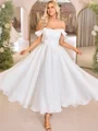This elegant A-line wedding dress features an off-the-shoulder neckline that beautifully frames the shoulders and collarbones. The sleeveless design highlights the arms, while delicate pleating adds texture and sophistication throughout the bodice and skirt. The fitted corset waist cinches the figure for a flattering silhouette. The ankle-length skirt offers a modern, chic touch, perfect for a stylish and graceful bride.