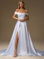 • A-line Off-the-Shoulder Pleated Chapel Train Satin Corset Wedding Dress