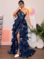 Turn heads in this A-line dress featuring a chic one-shoulder design, sleeveless silhouette, and adorned with appliques lace. The dress is elevated with a sweeping train and a tulle corset, offering a perfect blend of style and grace.