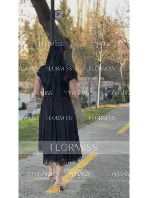 • A-Line/Princess Chiffon Applique Bateau Short Sleeves Tea-Length Mother of the Bride Dresses
