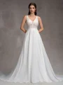 Feel extravagant in this A-line/Princess chiffon gown. Featuring lace details and a V-neckline, this sleeveless dress is perfect for brides seeking elegance. The court train enhances its regal appeal.