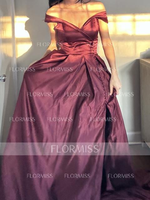 • A-Line/Princess Off-the-Shoulder Sweep Train Satin Prom Dresses With Leg Slit