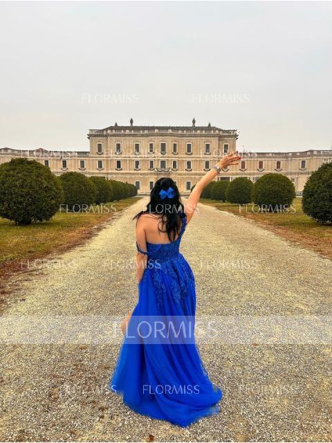 A-Line/Princess Off-the-Shoulder Sweep Train Tulle Prom Dresses With Leg Slit