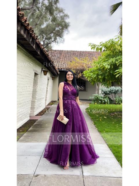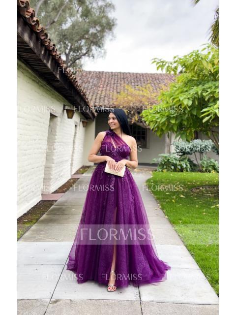 • A-Line/Princess One-Shoulder Sweep Train Tulle Prom Dresses With Leg Slit