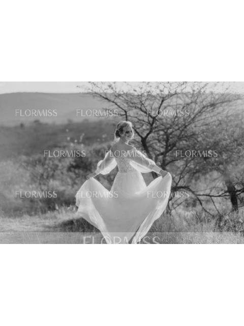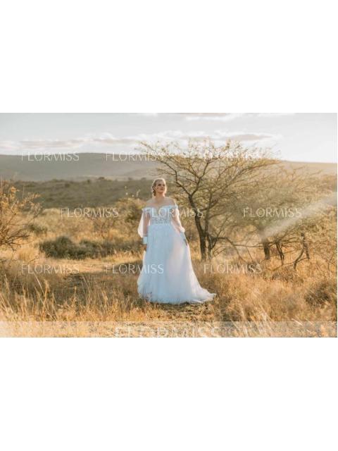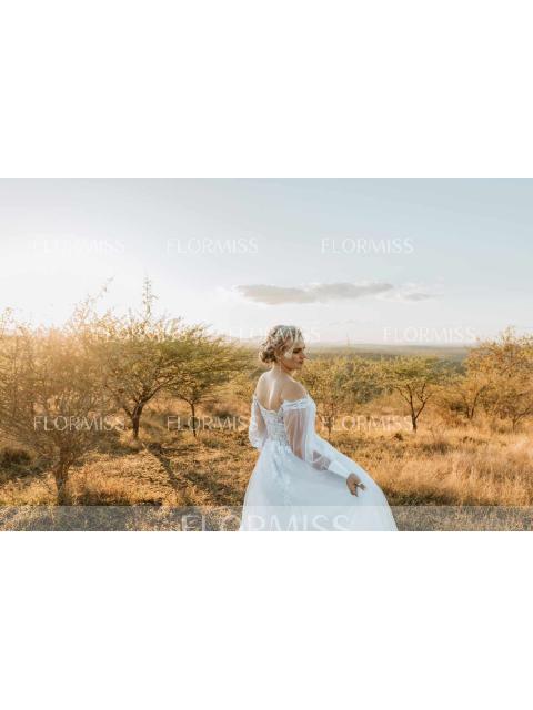 • A-Line/Princess Tulle Applique Off-the-Shoulder Long Sleeves Chapel Train Wedding Dresses