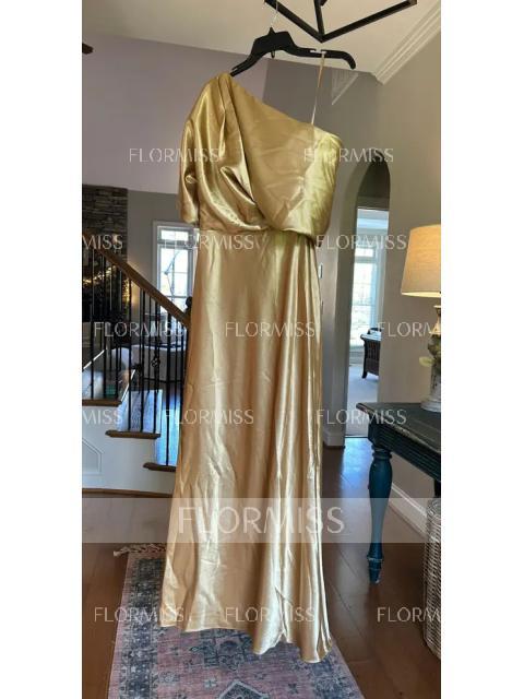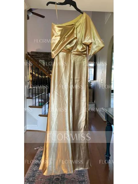• A-Line/Princess V-neck Floor-Length Short Sleeves Silk like Satin Bridesmaid Dress