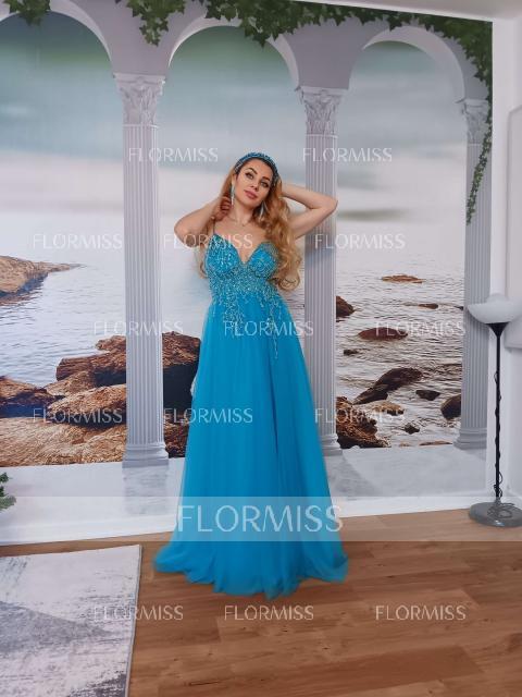 A-Line/Princess V-neck Floor-Length Tulle Prom Dresses With Beading