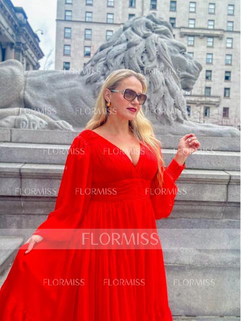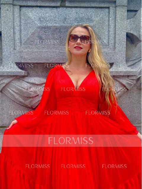 This chiffon gown is sure to enhance your visual appearance. Charms in a plunging V-neckline with long sleeves. The back has a low V-cut and a zipper closure. From the natural waist opens a full length A-line silhouette and finishes in floor length. Get ready to shine in this fabulous creation.