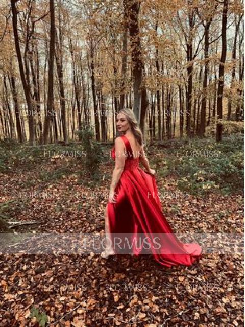 A-Line/Princess V-neck Sweep Train Silk Like Satin Evening Dresses With Leg Slit