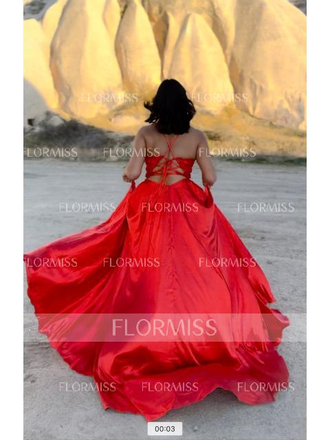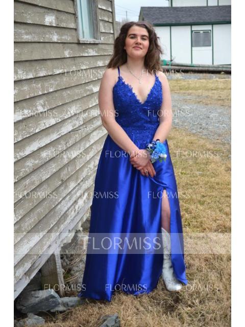 • A-Line/Princess V-neck Sweep Train Silk Like Satin Prom Dresses With Pockets