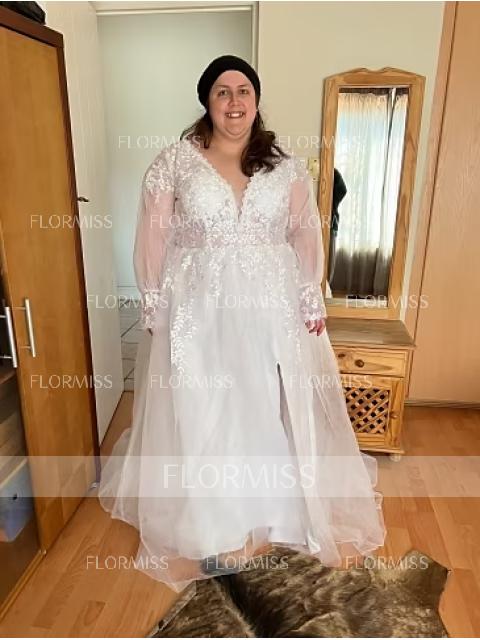 • A-Line/Princess V-neck Sweep Train Lace Wedding Dresses With Leg Slit