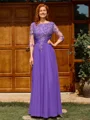 This floor-length chiffon mother of the bride dress features an A-line silhouette, offering a timeless and flattering look. The scoop neckline and half sleeves add a touch of elegance and sophistication. Delicate lace appliques adorn the ensemble, providing a romantic and feminine touch. Perfect for a mother who desires a graceful and refined appearance for her daughter's wedding.