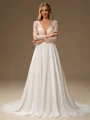 Capture timeless elegance in this A-line wedding dress, featuring a flattering scoop neckline and elegant long sleeves adorned with delicate lace appliques. Crafted from flowing chiffon, it drapes gracefully to the floor with a charming court train. Perfect for the bride seeking classic sophistication and romance on her special day.
