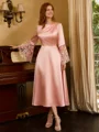 This tea-length mother of the bride dress exudes elegance with its A-line silhouette and classic scoop neckline. The long sleeves offer both coverage and style, while delicate lace appliques adorn the ensemble, adding a touch of romance and sophistication. Crafted from silk like satin, it ensures both comfort and a flattering fit. Perfect for a mother who desires a timeless and refined look for her daughter's wedding.
