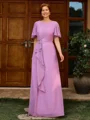 This floor-length chiffon mother of the bride dress showcases an A-line silhouette, providing a timeless and flattering look. The scoop neckline and short sleeves add an elegant touch, while delicate lace appliques adorn the ensemble, imparting a romantic and feminine vibe. Perfect for a mother who seeks a sophisticated and graceful appearance for her daughter's wedding.