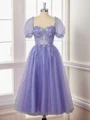 This is an elegant tea-length dress with an A-line silhouette and short sleeves. It features a lovely lace fabric with a sweetheart neckline, intricate lace appliques, and a flattering corset-style bodice, creating a timeless and romantic look.