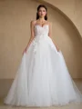 Elegant A-line wedding dress with spaghetti straps, a sleeveless design, and exquisite lace appliques. The gown features a court train crafted from delicate tulle, and a corset detail adds a touch of romance and sophistication to this timeless bridal ensemble.