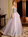 Make a stunning impression in this A-line prom dress featuring delicate spaghetti straps and a sleeveless design. Crafted from soft tulle, the floor-length silhouette is adorned with intricate lace appliques, creating a romantic and elegant look perfect for unforgettable formal occasions.