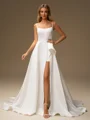 Exude timeless elegance in this A-line wedding dress, featuring delicate spaghetti straps, a sleeveless design, and a graceful chapel train. Crafted from luxurious satin, it drapes beautifully to enhance your silhouette. Perfect for a bride seeking classic sophistication and understated glamour on her special day.