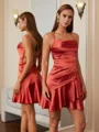 This A-line dress features delicate spaghetti straps and a sleeveless corset bodice that shapes and defines the waist. Made from silk-like satin, the fabric has a smooth and elegant finish. The skirt is decorated with ruffles that add texture and movement. The short or mini length creates a youthful and sophisticated look, perfect for parties, cocktail events, or special occasions.