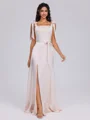 An A-line bridesmaid dress with a square neckline and sleeveless design. Made from silk-like satin, this floor-length dress features a delicate bow detail, adding a touch of elegance and charm for a sophisticated and timeless look.
