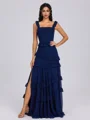 An A-line square neckline sleeveless bridesmaid dress featuring cascading ruffles and a floor-length design. This dress offers a graceful, feminine silhouette with beautiful, flowing layers for an elegant, timeless look.