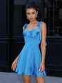 This A-line dress features slender straps and a sleeveless design for a graceful look. Made with a satin and chiffon blend, it combines smoothness and lightness. A delicate bow adds a feminine touch, while the corset bodice shapes the waist. The short/mini length offers an elegant and youthful silhouette