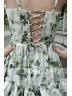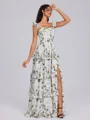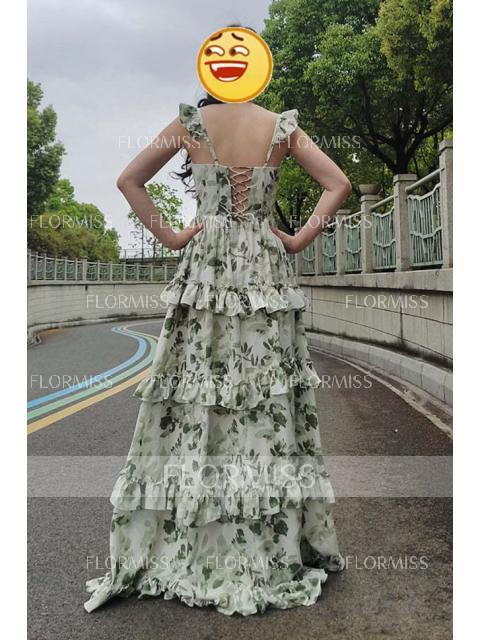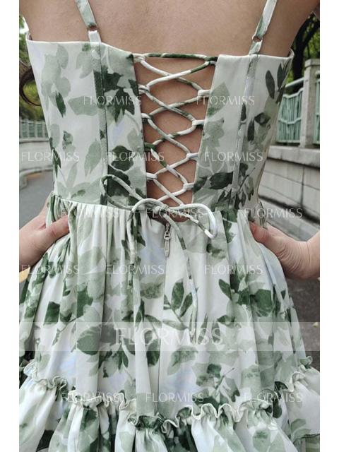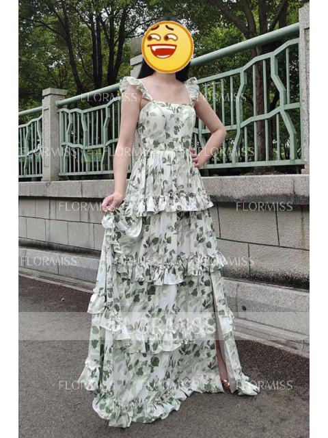 This charming A-line dress features delicate straps and a sleeveless design, with cascading ruffles adding a touch of elegance. The floor-length chiffon fabric provides a graceful and flowing silhouette.