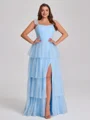This A-line bridesmaid dress features slender straps and a sleeveless design for an airy, elegant look. Crafted from soft tulle with cascading ruffles, it offers graceful movement and texture. The corset bodice defines the waist, while the floor-length skirt creates a flattering silhouette-perfect for plus size bridal parties.