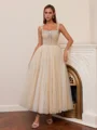 This elegant A-line dress features delicate straps and a sleeveless bodice, designed with a structured corset for a flattering silhouette. The bodice is adorned with shimmering rhinestones, adding a touch of sparkle and sophistication. Crafted from smooth fabric, the skirt flows gracefully to an ankle-length hem, creating a timeless and refined look. Perfect for formal events, evening parties, or special occasions.