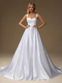 Radiate timeless elegance in this A-line wedding dress, featuring delicate straps and a flattering sleeveless design. Crafted from luxurious satin, it drapes gracefully to the floor with a sweeping train. The corset bodice ensures a perfect fit, making it ideal for the bride who desires classic beauty and sophistication on her special day.