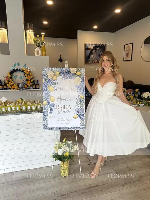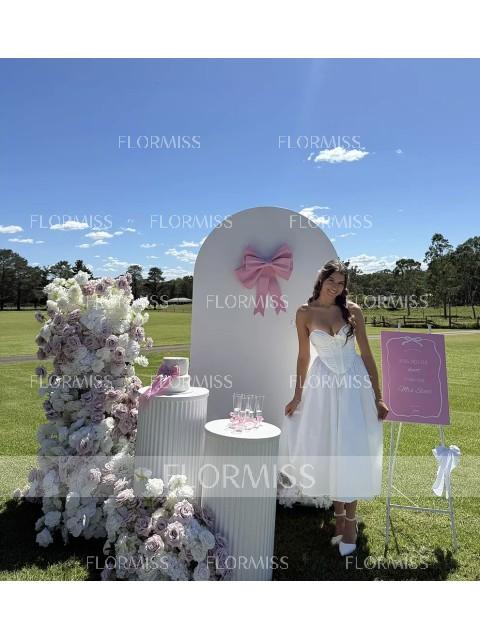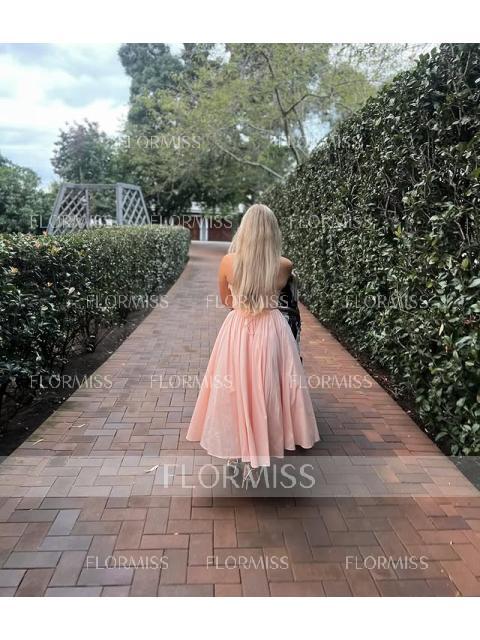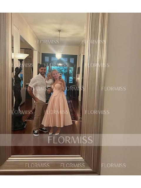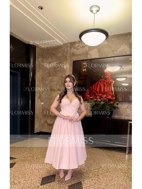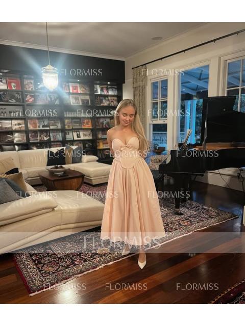 This A-line dress features a romantic sweetheart neckline and sleeveless design. A charming bow detail adds a feminine touch, while the corset bodice shapes the waist. The tea-length skirt offers an elegant and graceful silhouette