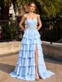 This A-line prom dress features a sweetheart neckline and a sleeveless design for a flattering, elegant look. Crafted from flowing chiffon, the floor-length silhouette is enhanced with cascading ruffles, creating a graceful and romantic effect perfect for formal occasions.