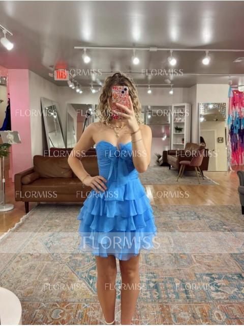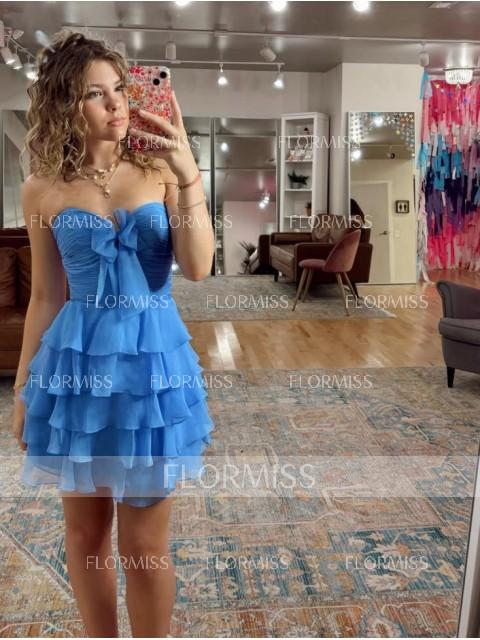 This A-line dress features a sweetheart neckline and a sleeveless corset bodice that enhances the waist. Made from soft chiffon, the skirt flows with cascading ruffles that add texture and movement. The short or mini length gives a youthful and elegant look, perfect for parties, proms, or special occasions.