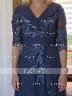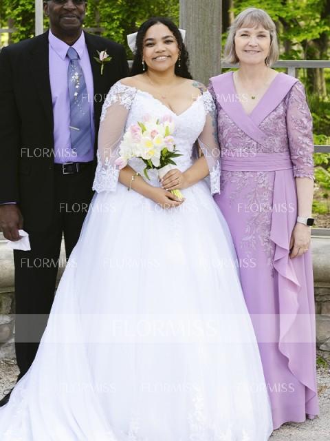 This floor-length chiffon mother of the bride dress showcases an A-line silhouette, providing a flattering and timeless look. The V-neckline and 3/4 sleeves add an elegant touch, while delicate lace appliques adorn the ensemble, creating a romantic and feminine vibe. Perfect for a mother who seeks a sophisticated and graceful appearance for her daughter's wedding.