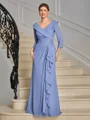 A beautiful A-line Mother of the Bride dress featuring a V-neckline and 3/4 sleeves. The dress is enhanced with delicate ruffles that add texture and movement, creating a soft and feminine look. Made from lightweight chiffon, it offers a comfortable and flattering fit. The floor-length silhouette provides an elegant and sophisticated appearance, making it the perfect choice for a memorable and stylish look on the special day.