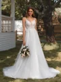 Sleeveless A-line wedding dress with a V-neck, lace appliques, and a chapel train in tulle fabric.