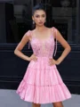 This A-line dress features a flattering V-neck and sleeveless design. Delicate lace appliques adorn the smooth taffeta fabric, adding romantic texture. The corset bodice shapes the waist, while the short/mini length offers a youthful and elegant silhouette