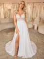 This elegant A-line wedding dress features a flattering V-neckline that beautifully enhances the d