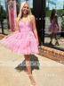 A sleeveless A-line dress with a V-neckline, adorned with cascading ruffles. The dress is made from tulle fabric and falls at a short/mini length.
