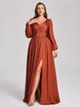 This A-line bridesmaid dress features a flattering V-neckline and elegant long sleeves. Crafted from a blend of satin and chiffon, it offers a smooth, flowing finish with delicate pleats for added texture. The floor-length skirt creates a graceful and sophisticated silhouette-perfect for plus size bridal parties.