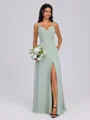 This elegant A-line dress features a V-neckline and sleeveless design, with pleated detailing for added texture. The floor-length chiffon fabric creates a graceful and flowing silhouette, perfect for a sophisticated look.