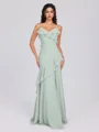 An A-line V-neck sleeveless bridesmaid dress with ruffles and a floor-length chiffon design. This dress offers a soft, flowing silhouette with delicate ruffle details, creating a romantic and elegant look perfect for a wedding celebration.