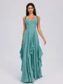 This elegant A-line bridesmaid dress features a V-neckline and a sleeveless design. Made from chiffon, the floor-length gown is adorned with delicate ruffles, creating a graceful and timeless look perfect for a wedding.