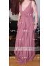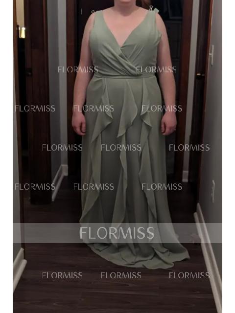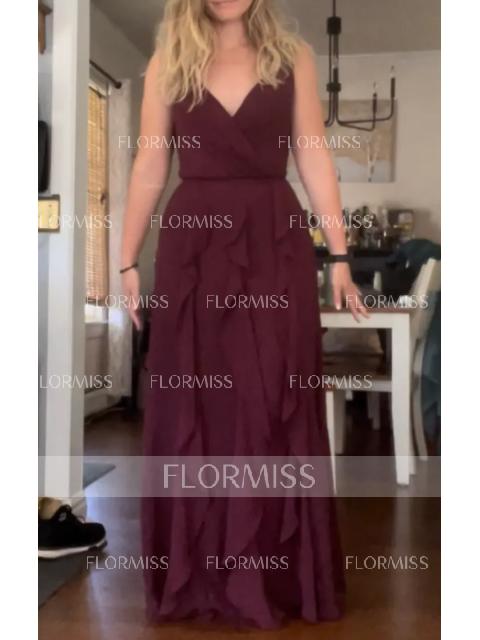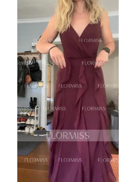 A graceful A-line bridesmaid dress featuring a V-neckline and sleeveless design. Made from soft chiffon, this floor-length dress flows beautifully, creating an elegant and feminine silhouette. The ruffle details add texture and movement, enhancing the overall romantic and chic style, making it an ideal choice for a timeless wedding look.